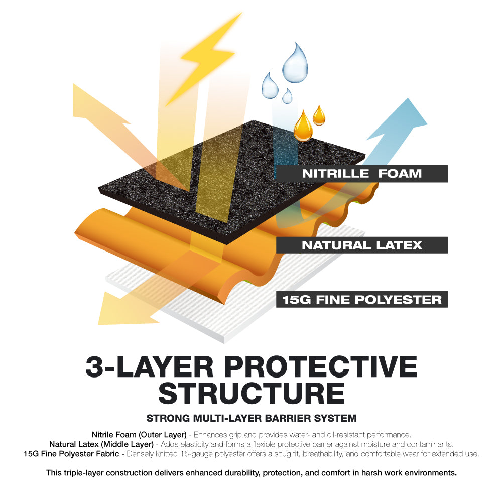 Built with a triple-layer construction, the 007-WP performs reliably in wet and oily environments. The nitrile foam coated palm reduces slipping, while the inner liner provides a comfortable and flexible fit for extended wear. A responsive touchscreen-compatible design allows users to operate smart devices without removing their gloves, improving efficiency on site.