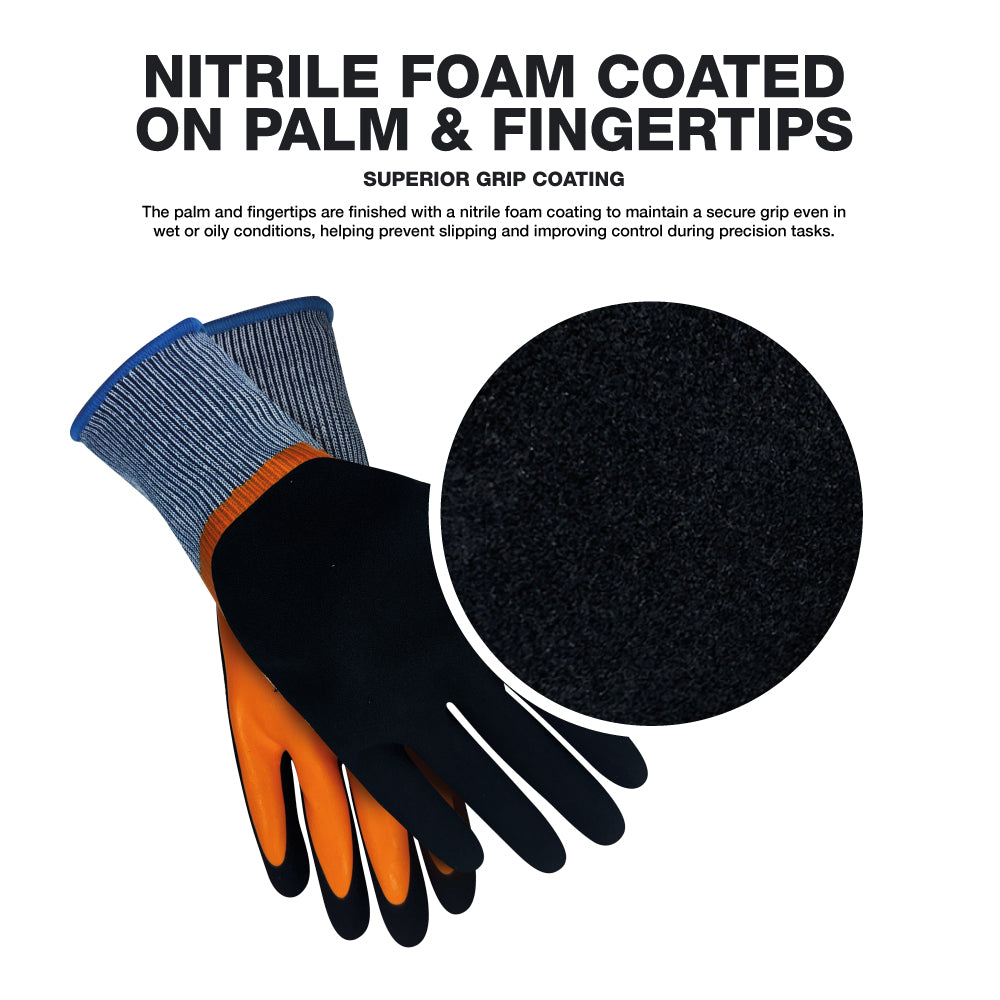 Foam nitrile coated palm and fingertips help maintain a secure grip in wet and oily conditions, reducing slipping during maintenance and industrial tasks.